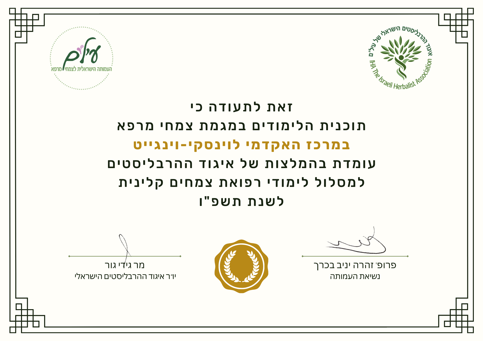 למסיימים העומדים בדרישות המגמה תוענק בסיום מסלול הלימודים תעודת "הרבליסט קליני Clinical Herbalist – CL.H" מטעם Medi Win, בית הספר לרפואה משלימה במרכז האקדמי לוינסקי-וינגייט (קמפוס וינגייט).