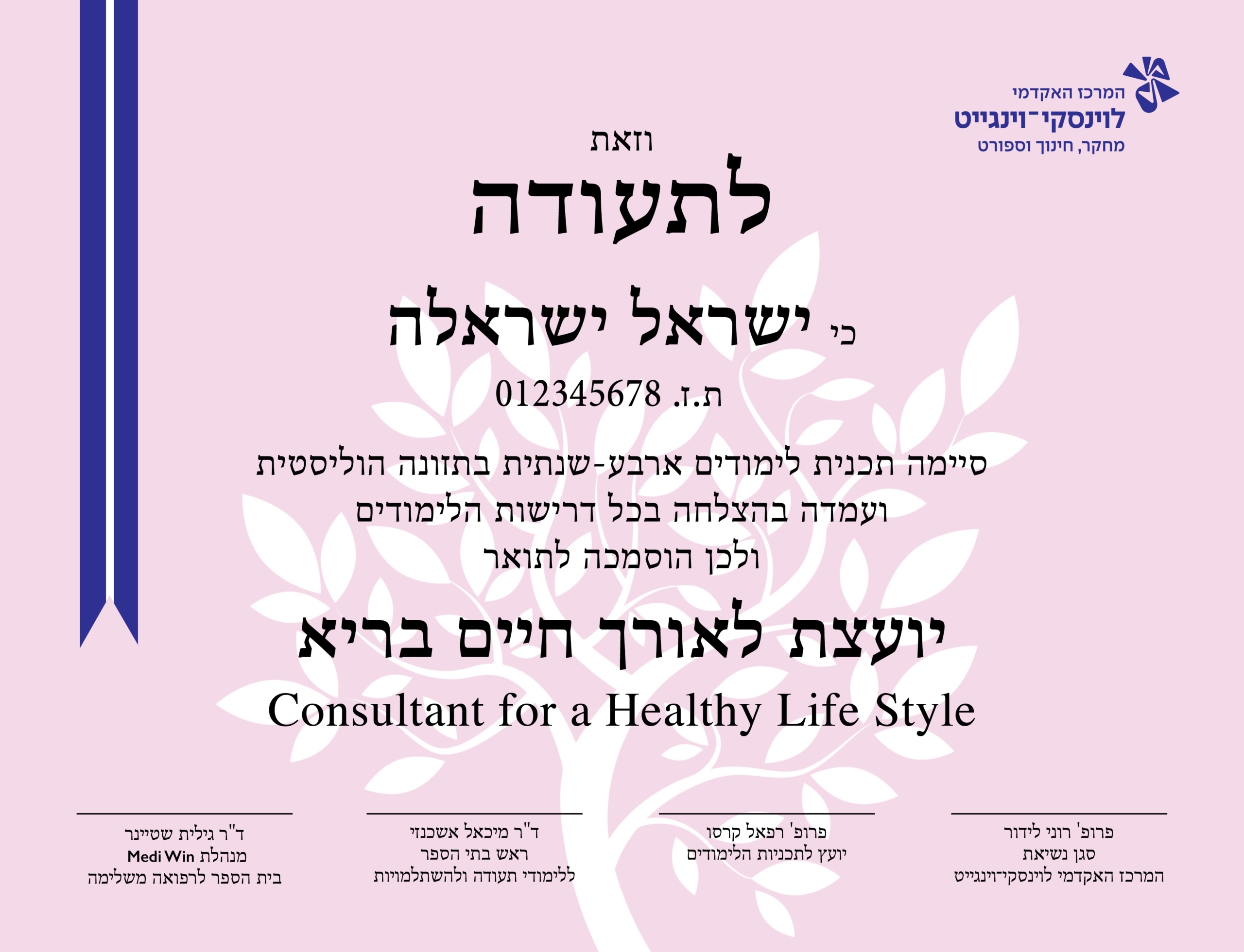 תעודות – למסיימים העומדים בדרישות, תוענק בסוף מסלול הלימודים תעודת "סיים מגמה ארבע-שנתית בתזונה הוליסטית והוסמך ליועץ לאורח חיים בריא" מטעם Medi Win – בית הספר לרפואה משלימה במרכז האקדמי לוינסקי-וינגייט (קמפוס וינגייט). כמו כן, תוענק תעודת "יועץ מוסמך בצמחי מרפא" ותעודת השתתפות בקורס מודעות והעצמה.