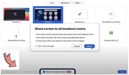 - בחרו את המסך שתרצו לשתף ולחצו על שיתוף לחדרים (Share to breakout rooms).