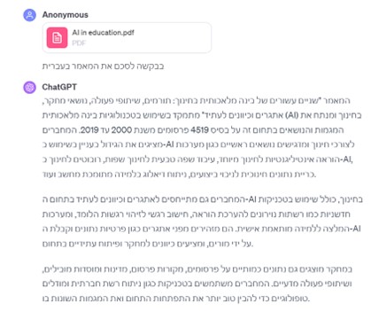 ביקשנו מהמערכת לסכם מאמר בפורמט pdf ושאלנו כמה שאלות עליו: