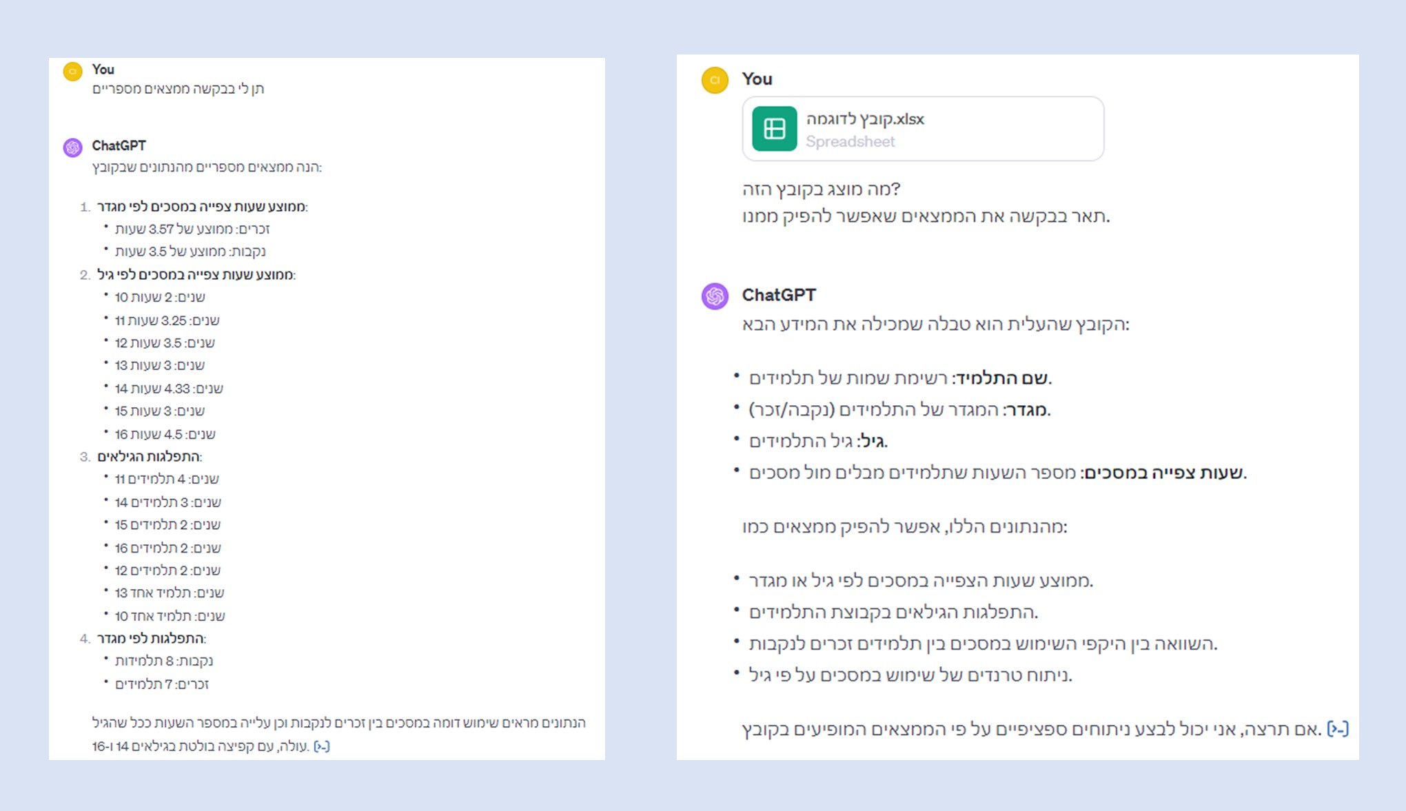 בדוגמה השנייה העלינו קובץ אקסל עם נתוני שימוש במסכים. ביקשנו מ-ChatGPT לתאר מה מוצג בקובץ וכן להציג נתונים מספריים שיופקו מתוך הקובץ.