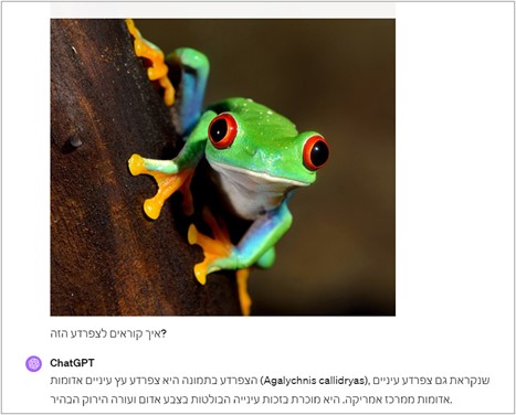 העלינו תמונה של צפרדע בשם: "אילנית אדומת עין" וביקשנו מהמערכת לזהות מה בתמונה.