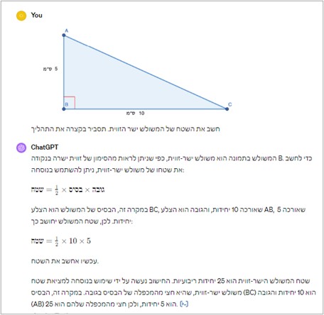 ודוגמה נוספת מתחום הגיאומטריה: העלינו תמונה של משולש וביקשנו מהצ'ט שייחשב את שטחו. כאן, התשובה כמובן נכונה וגם ההסבר המצורף.