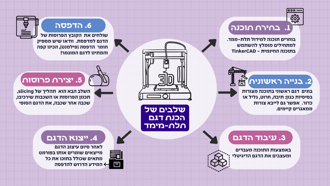 הדפסה בתלת־ממד מתרחשת על פני כמה שלבים המוצגים בתרשים בהמשך. תחילה, מבצעים את תהליך המידול בתוכנה כגון TinkerCad, שבה בונים את הדגם באופן דיגיטלי על מסך המחשב. בשלב הבא, מכינים את הקובץ הדיגיטלי להדפסה בתהליך שנקרא Slicing. לבסוף שולחים את הקובץ למדפסת שמדפיסה את הדגם לפי ההנחיות המדויקות בקובץ.